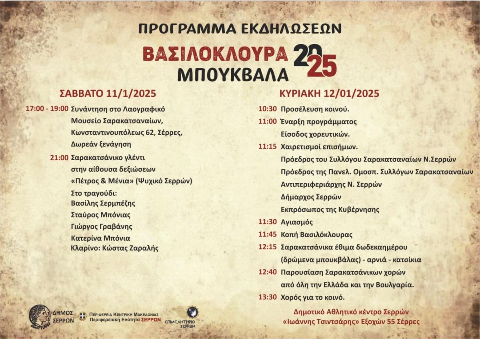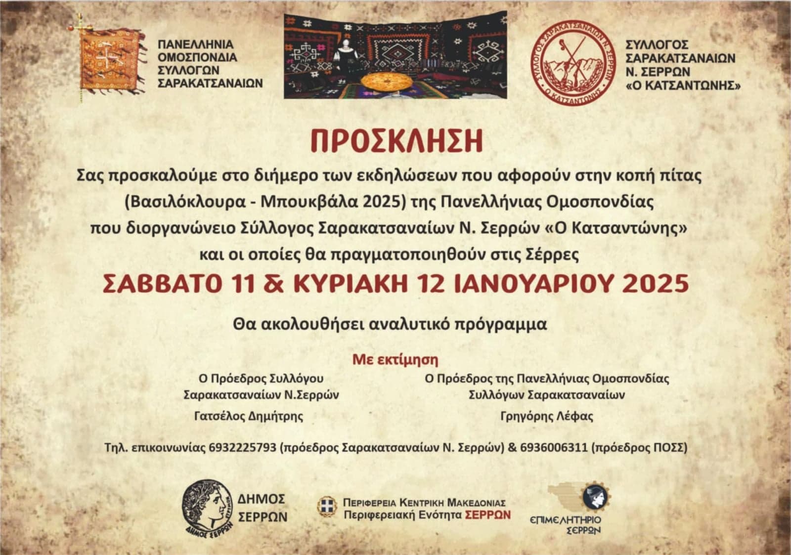 Η Πανελλήνια Ομοσπονδία Συλλόγων Σαρακατσαναίων (Π.Ο.Σ.Σ.), σε συνεργασία με τον Σύλλογο Σαρακατσαναίων Σερρών «Ο ΚΑΤΣΑΝΤΩΝΗΣ», διοργανώνει τη διήμερη εκδήλωση με τίτλο «ΒΑΣ(Ι)ΛΟΚΛΟΥΡΑ -ΜΠΟΥΚ(ΟΥ)ΒΑΛΑ 2025» για το καλό του χρόνου. Η κεντρική εκδήλωση θα διεξαχθεί στο Κλειστό Γυμναστήριο Σερρών «Ιωάννης Τσιντσάρης». Σκοπός και στόχος είναι η καθιερωμένηπλέον εκδήλωση, που πραγματοποιείται κάθε δεύτερο Σαββατοκύριακο του Ιανουαρίου σε διαφορετική γεωγραφική περιοχή, σε συνεργασία με τους κατά τόπους συλλόγους μας, να αποτελέσει ένα …Αντάμωμα στα Χειμαδιά…