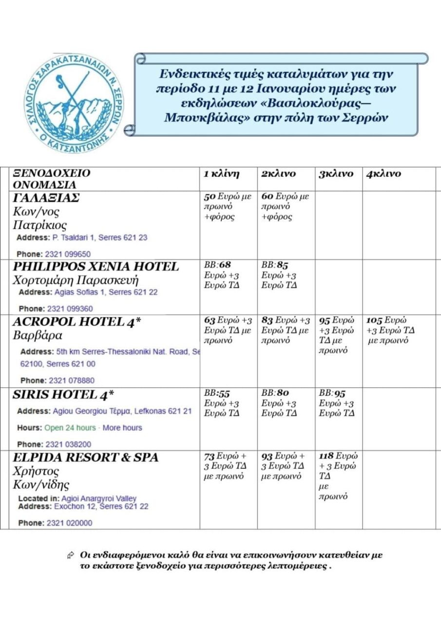 Κατόπιν συνεννόησης του Συλλόγου με την Ένωση ξενοδόχων Ν. Σερρών σας διαβιβάζουμε λίστα με διαθεσιμότητες αλλά και τιμές για τα ξενοδοχεία της περιοχής Σερρών.